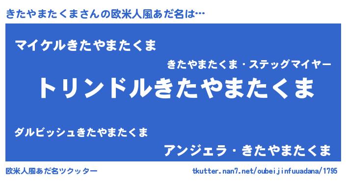 | 男性向けラノベタイトル風あだ名 | 『きたやまたくま~年齢イコール彼女いない歴の魔法使い~』 |