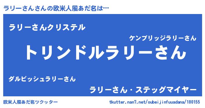 | 男性向けラノベタイトル風あだ名 | 『ラリーさん~年齢イコール彼女いない歴の魔法使い~』 |