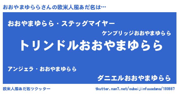 | 男性向けラノベタイトル風あだ名 | 『おおやまゆらら~年齢イコール彼女いない歴の魔法使い~』 |