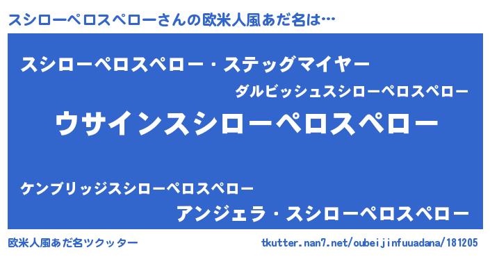 | 男性向けラノベタイトル風あだ名 | 『スシローペロスペローの嫁は女の子じゃないと思った?』 |