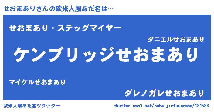 | 男性向けラノベタイトル風あだ名 | 『Re:せおまありから始める異世界生活』 |