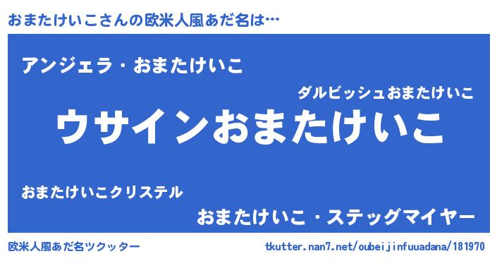 | 女子向けラノベタイトル風あだ名 | 『おまたけいこの卵を拾いまして』 |