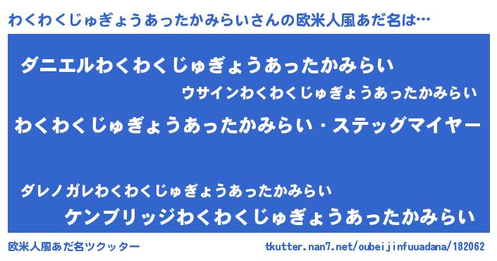 | 男性向けラノベタイトル風あだ名 | 『うちのわくわくじゅぎょうあったかみらいが世界を掌握している!』 |