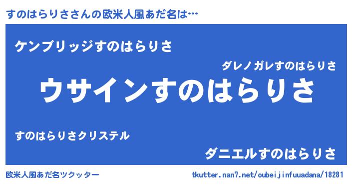 | 男性向けラノベタイトル風あだ名 | 『すのはらりさの嫁は女の子じゃないと思った?』 |