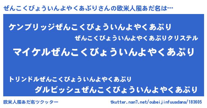 | 男性向けラノベタイトル風あだ名 | 『ゼンコクビョウインヨヤクアプリアートオンライン』 |
