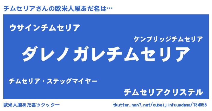 | 男性向けラノベタイトル風あだ名 | 『この素晴らしい世界にチムセリアを!』 |