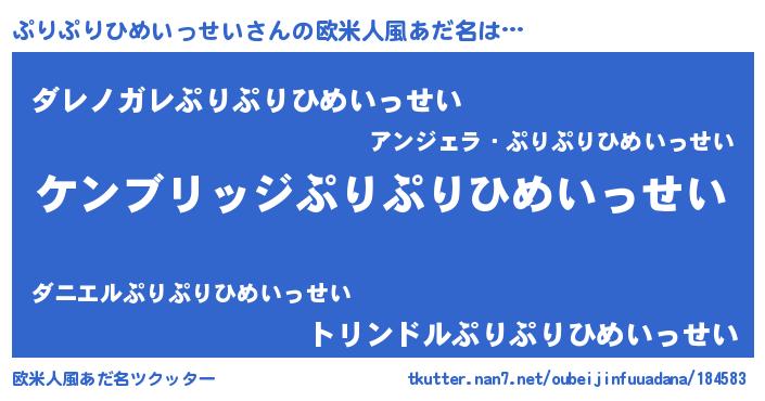 | 男性向けラノベタイトル風あだ名 | 『Re:ぷりぷりひめいっせいから始める異世界生活』 |