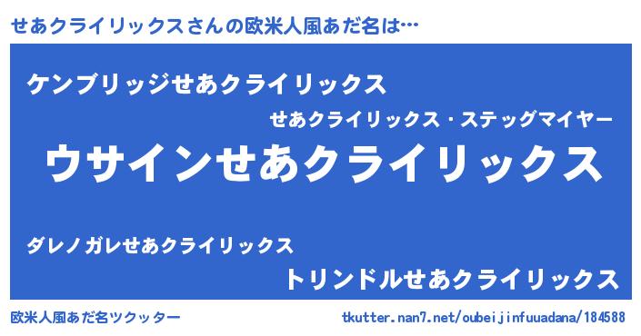 | 意味不明あだ名 | 『とにかく怪しいせあクライリックス』 |