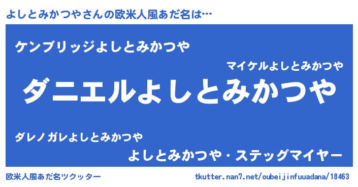 | 男性向けラノベタイトル風あだ名 | 『おまえをオタクにしてやるから、俺をよしとみかつやにしてくれ! 』 |