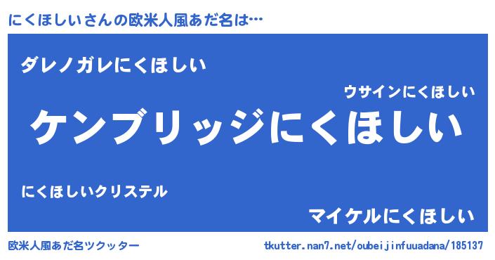 | 男性向けラノベタイトル風あだ名 | 『Re:にくほしいから始める異世界生活』 |