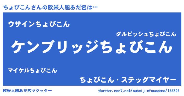 | 男性向けラノベタイトル風あだ名 | 『Re:ちょびこんから始める異世界生活』 |