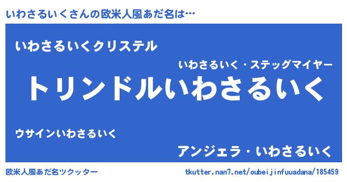 | 男性向けラノベタイトル風あだ名 | 『いわさるいく~年齢イコール彼女いない歴の魔法使い~』 |