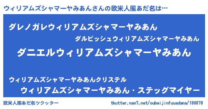 | 男性向けラノベタイトル風あだ名 | 『ノーゲーム・ノーウィリアムズシャマーヤミアン』 |