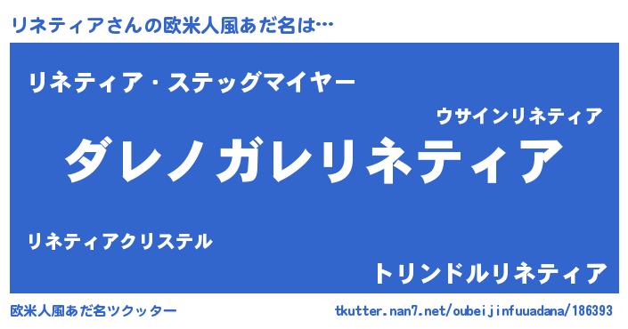 | 男性向けラノベタイトル風あだ名 | 『この素晴らしい世界にリネティアを!』 |