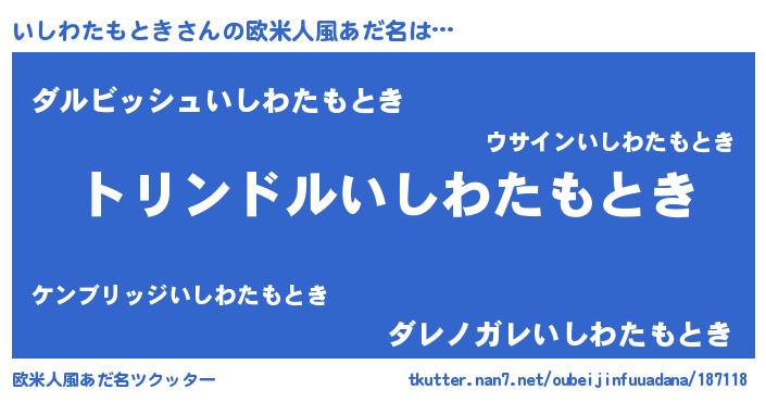 | 男性向けラノベタイトル風あだ名 | 『いしわたもとき~年齢イコール彼女いない歴の魔法使い~』 |