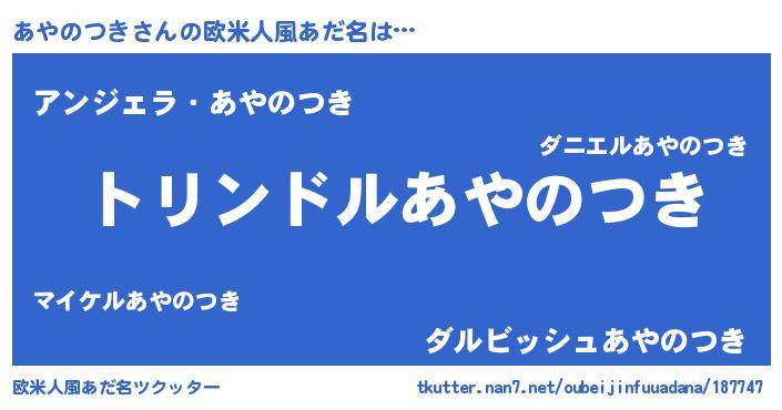 | 男性向けラノベタイトル風あだ名 | 『あやのつき~年齢イコール彼女いない歴の魔法使い~』 |