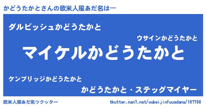 | 男性向けラノベタイトル風あだ名 | 『カドウタカトアートオンライン』 |