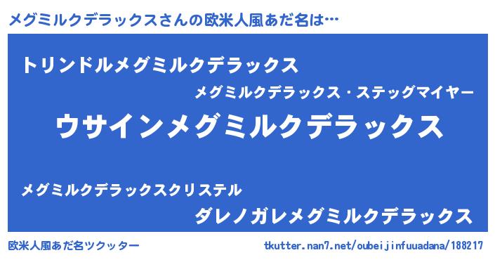 | 男性向けラノベタイトル風あだ名 | 『メグミルクデラックスの嫁は女の子じゃないと思った?』 |