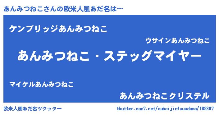 | 男性向けラノベタイトル風あだ名 | 『うちのあんみつねこが世界を掌握している!』 |