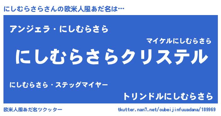 | 男性向けラノベタイトル風あだ名 | 『やはりにしむらさらの青春ラブコメはまちがっている 』 |
