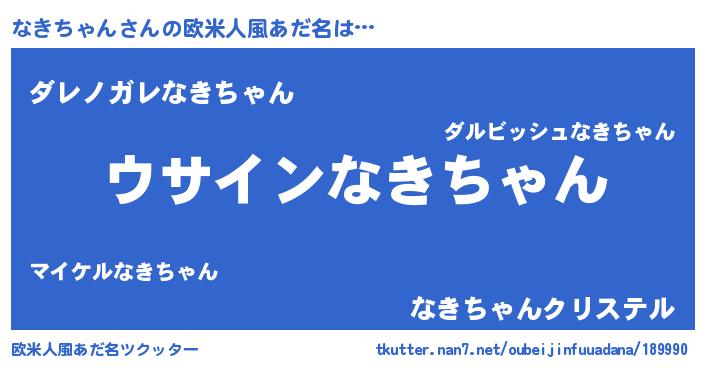 | 男性向けラノベタイトル風あだ名 | 『なきちゃんの嫁は女の子じゃないと思った?』 |