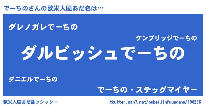 | 男性向けラノベタイトル風あだ名 | 『でーちのという概念が存在しない退屈な世界 』 |