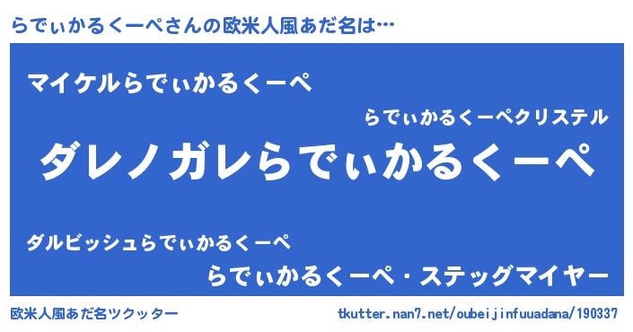 | 意味不明あだ名 | 『住所不定無職らでぃかるくーぺ(4歳)』 |