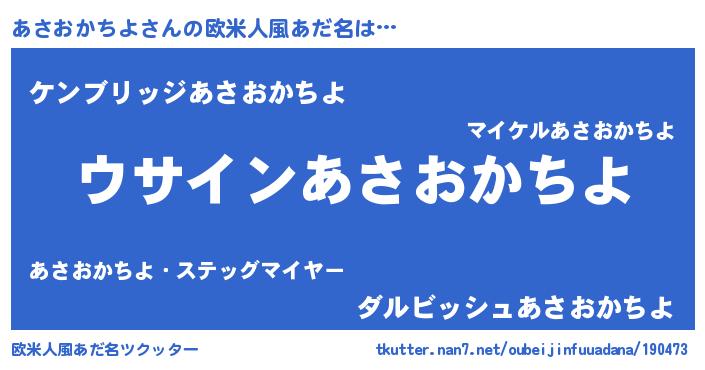 | 男性向けラノベタイトル風あだ名 | 『あさおかちよの嫁は女の子じゃないと思った?』 |