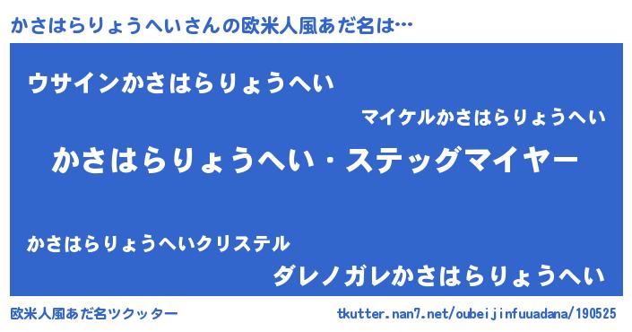 | 胡散臭い通販商品みたいなあだ名 | 『信頼と実績のサプリメント…その名も「かさはらりょうへい」』 |