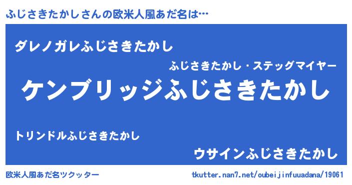 | 男性向けラノベタイトル風あだ名 | 『Re:ふじさきたかしから始める異世界生活』 |