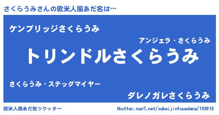 | 男性向けラノベタイトル風あだ名 | 『さくらうみ~年齢イコール彼女いない歴の魔法使い~』 |