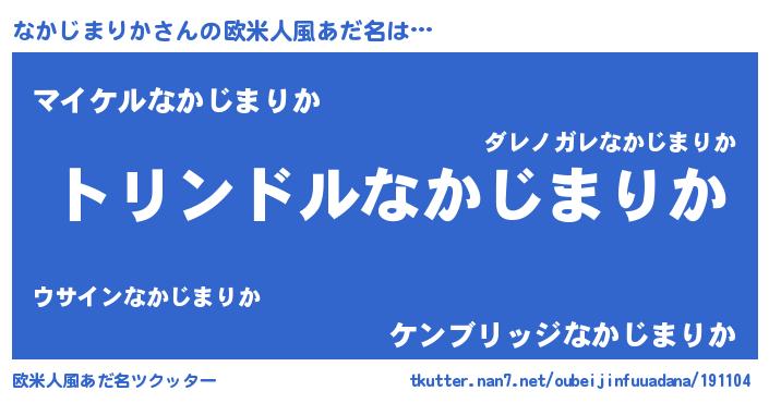 | 男性向けラノベタイトル風あだ名 | 『なかじまりか~年齢イコール彼女いない歴の魔法使い~』 |
