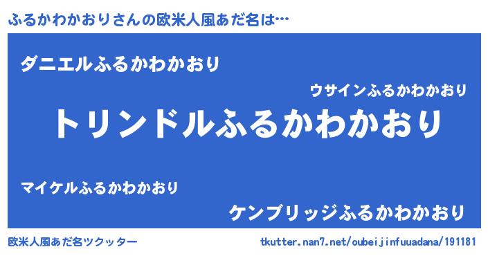 | 男性向けラノベタイトル風あだ名 | 『ふるかわかおり~年齢イコール彼女いない歴の魔法使い~』 |