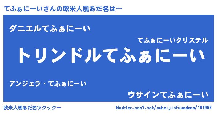 | 女子向けラノベタイトル風あだ名 | 『てふぁにーいの玉の輿計画!』 |