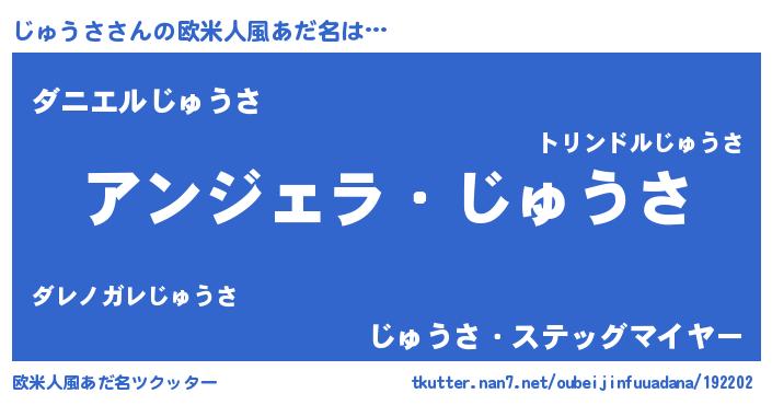 | 男性向けラノベタイトル風あだ名 | 『じゅうさに滅ぼされるだけの簡単なお仕事です』 |
