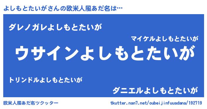 | 男性向けラノベタイトル風あだ名 | 『よしもとたいがの嫁は女の子じゃないと思った?』 |