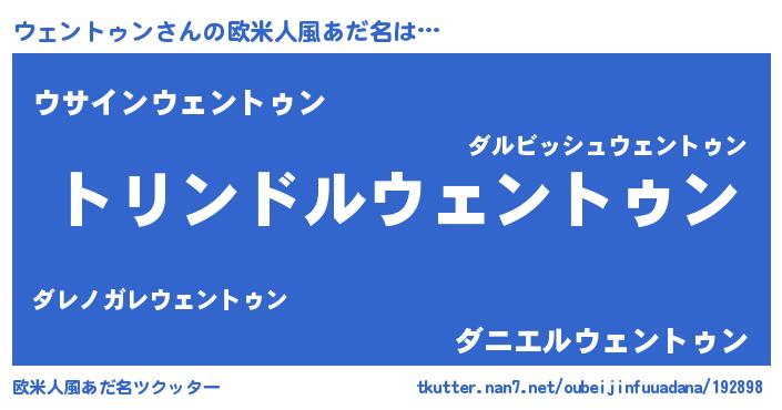 | 男性向けラノベタイトル風あだ名 | 『ウェントゥン~年齢イコール彼女いない歴の魔法使い~』 |