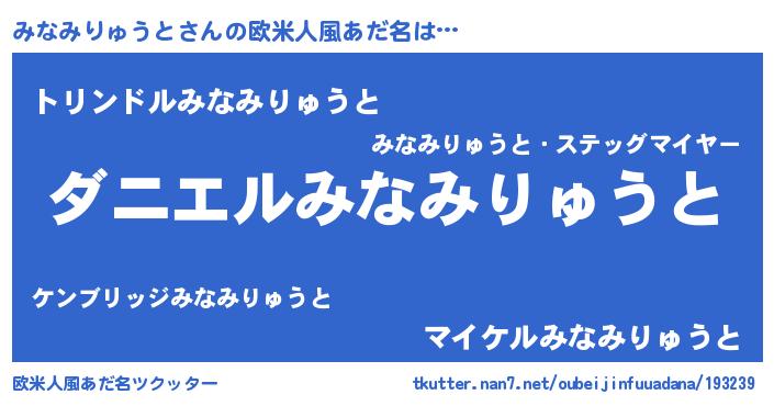 | 男性向けラノベタイトル風あだ名 | 『おまえをオタクにしてやるから、俺をみなみりゅうとにしてくれ! 』 |