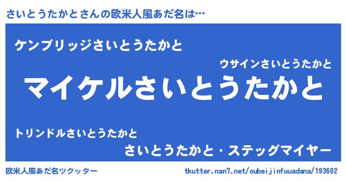 | 男性向けラノベタイトル風あだ名 | 『サイトウタカトアートオンライン』 |