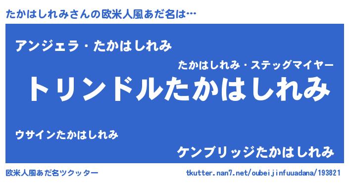 | 男性向けラノベタイトル風あだ名 | 『たかはしれみ~年齢イコール彼女いない歴の魔法使い~』 |