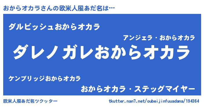 | 男性向けラノベタイトル風あだ名 | 『魔弾の王とおからオカラ』 |