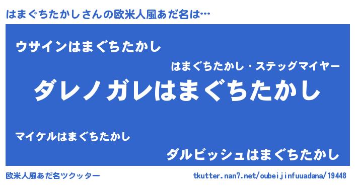 | 男性向けラノベタイトル風あだ名 | 『この素晴らしい世界にはまぐちたかしを!』 |