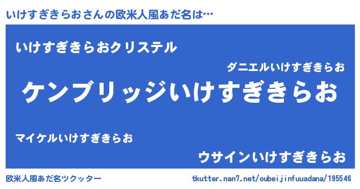| 男性向けラノベタイトル風あだ名 | 『Re:いけすぎきらおから始める異世界生活』 |