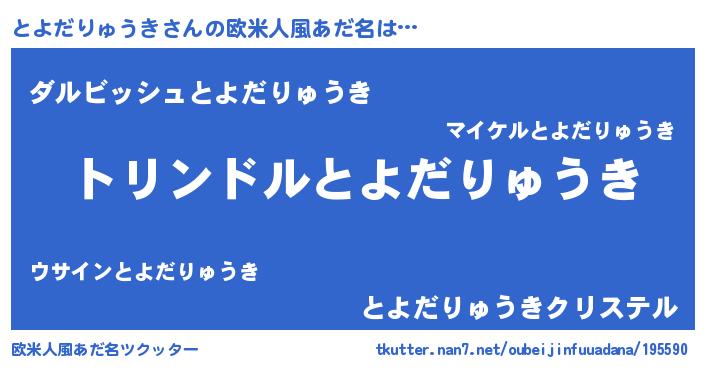 | 男性向けラノベタイトル風あだ名 | 『とよだりゅうき~年齢イコール彼女いない歴の魔法使い~』 |