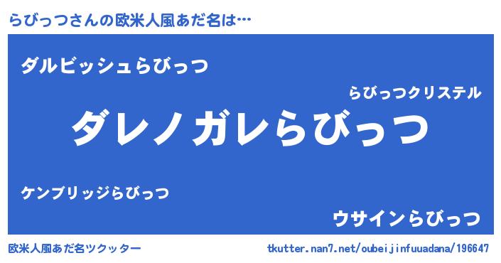 | 男性向けラノベタイトル風あだ名 | 『この素晴らしい世界にらびっつを!』 |
