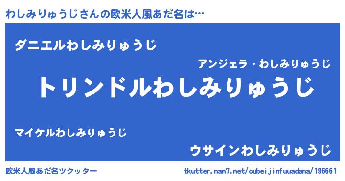 | 男性向けラノベタイトル風あだ名 | 『わしみりゅうじ~年齢イコール彼女いない歴の魔法使い~』 |