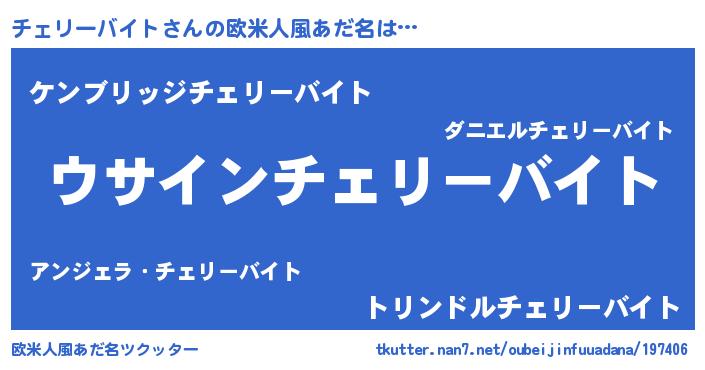 | 胡散臭い通販商品みたいなあだ名 | 『信頼と実績のサプリメント…その名も「チェリーバイト」』 |