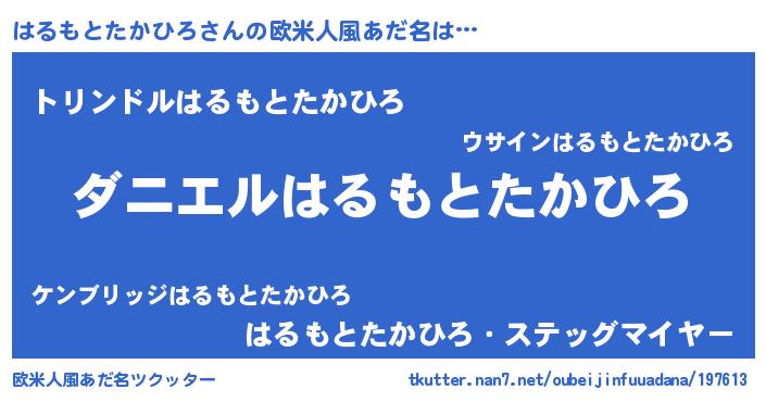 | 男性向けラノベタイトル風あだ名 | 『おまえをオタクにしてやるから、俺をはるもとたかひろにしてくれ! 』 |