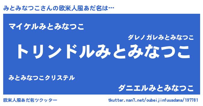| 男性向けラノベタイトル風あだ名 | 『みとみなつこ~年齢イコール彼女いない歴の魔法使い~』 |