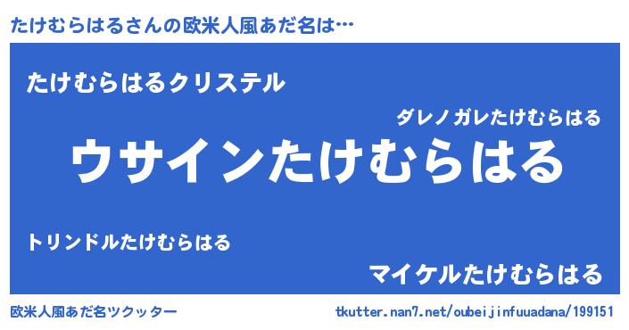 | 男性向けラノベタイトル風あだ名 | 『ダンジョンにたけむらはるを求めるのは間違っているだろうか』 |